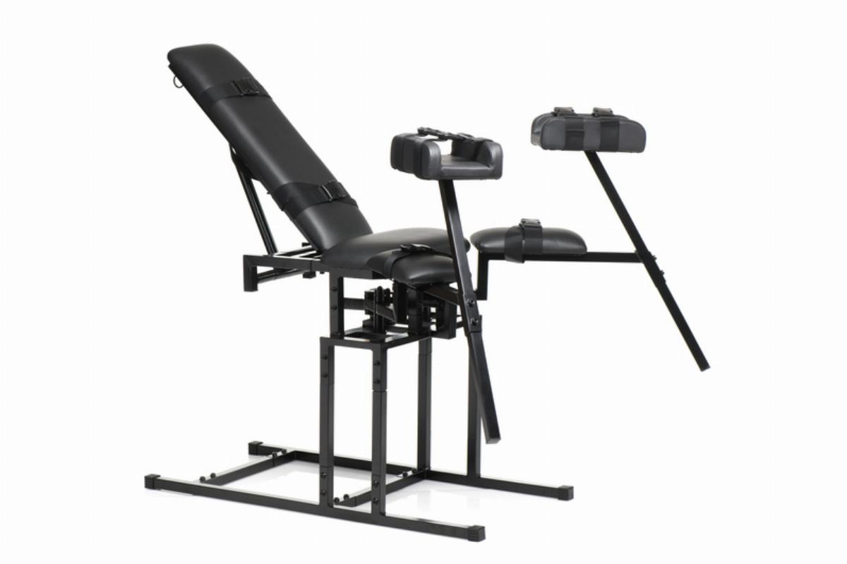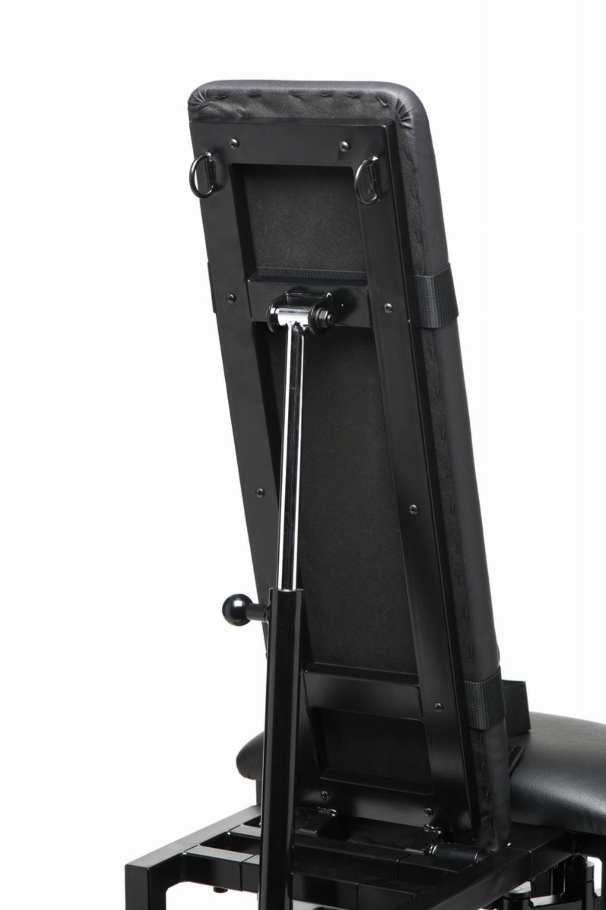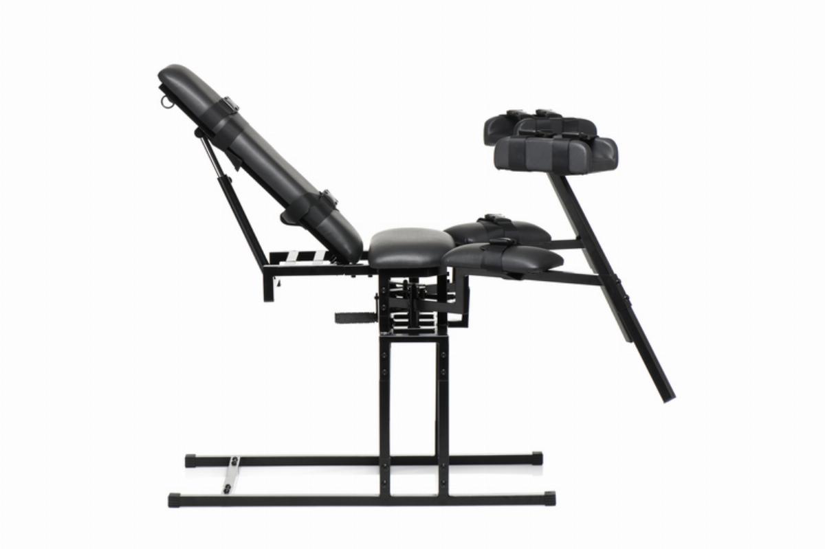 Entworfen, um bis zu 150 kg Gewicht zu tragen, verfügt dieser Stuhl über verstellbare Teile für deine Beine, mit denen du die Höhe und Breite anpassen kannst, sowie eine Rückenlehne, die deinen Partner vom Sitzen in die horizontale Liegeposition bringen kann.