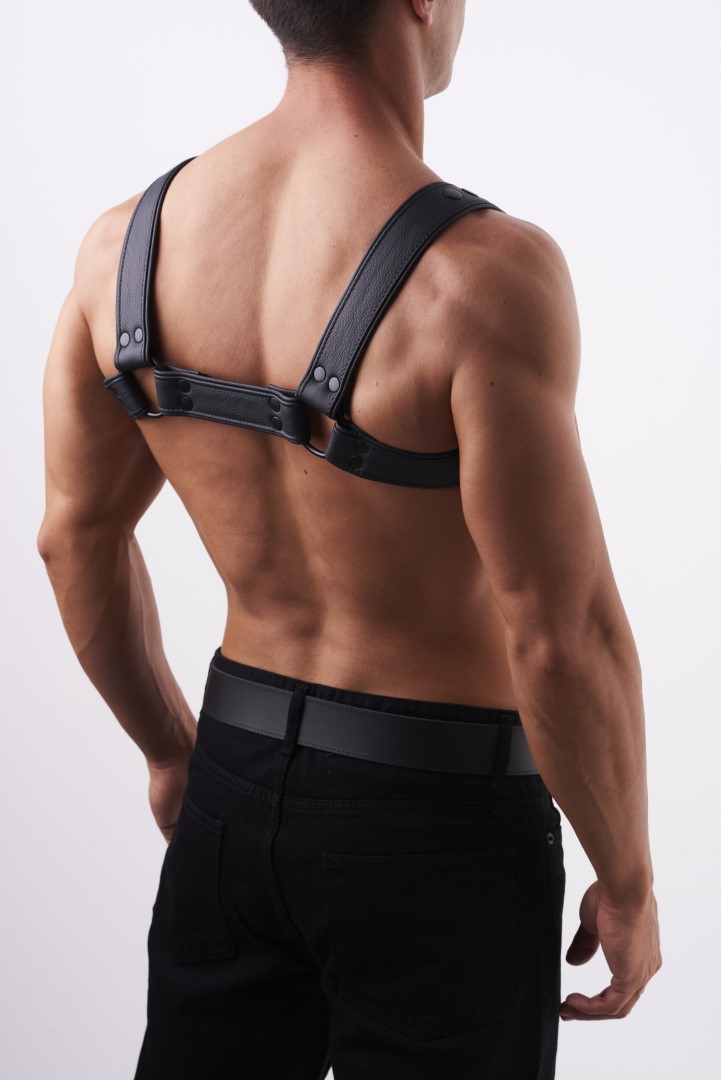 Schlinge die weichen 4 cm breiten Ledergürtel mit abgerundeten Kanten um Deine Brust und trage das Geschirr zu jedem möglichen Anlass.