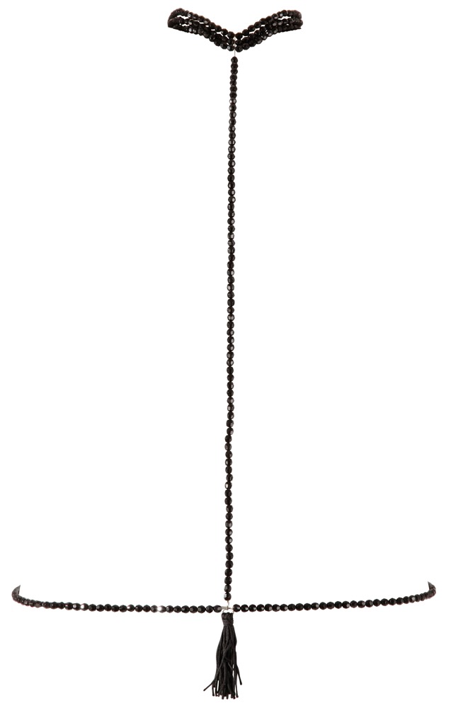 Elastische, dreireihige Perlenkette für den Hals - durch eine weitere Kette verbunden mit der Bikinikette, die hinten mit einem kleinen Karabiner zu schließen ist. Vorne am Bauch ist ein kleiner Fransenpuschel.