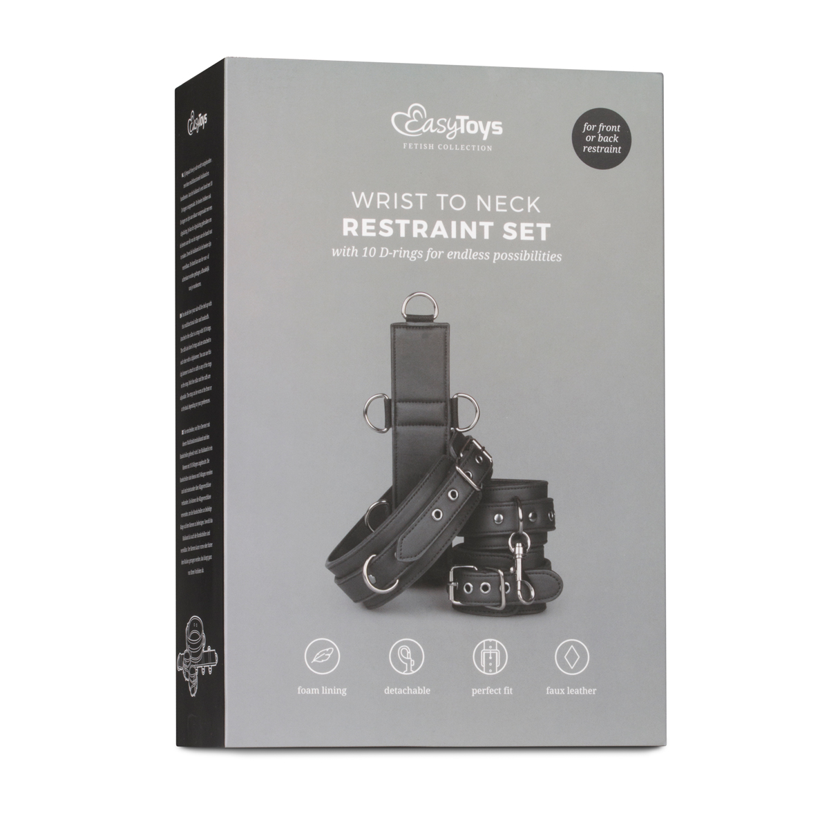 Sowohl die Handschellen als auch das Halsband sind für eine perfekte Passform leicht einstellbar. Das robuste Kunstleder ist mit Schaum gefüttert, um ein Aufkratzen der Haut zu vermeiden und eine komfortable Anwendung sicherzustellen.