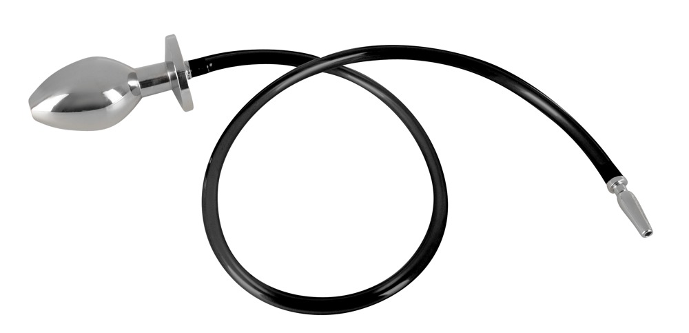 Der hohle, schwere Analplug ist über den Schlauch mit dem offenen