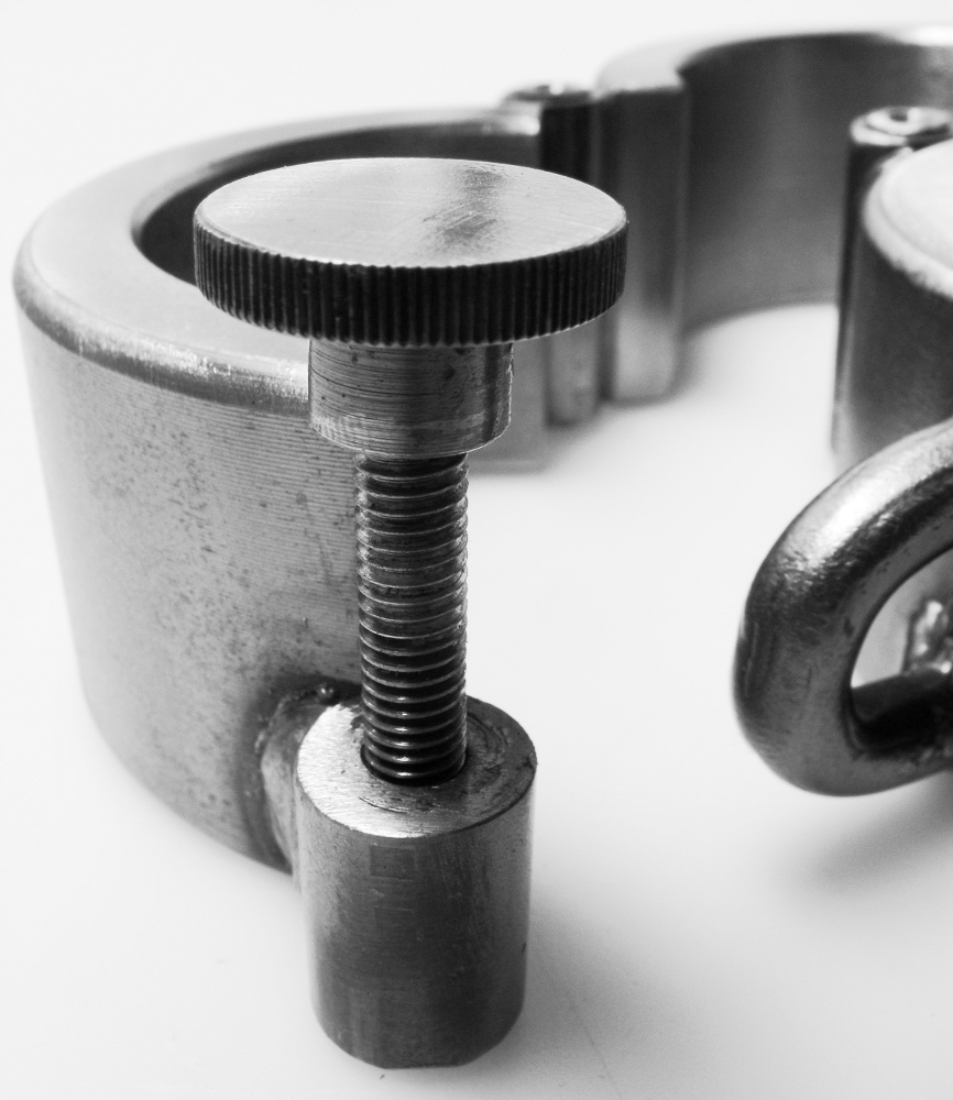 Sehr fein gearbeitetes Set aus einem Halseisen mit einer Öse und jeweils zwei Hand- und Fußfesseln in Stahlblank.