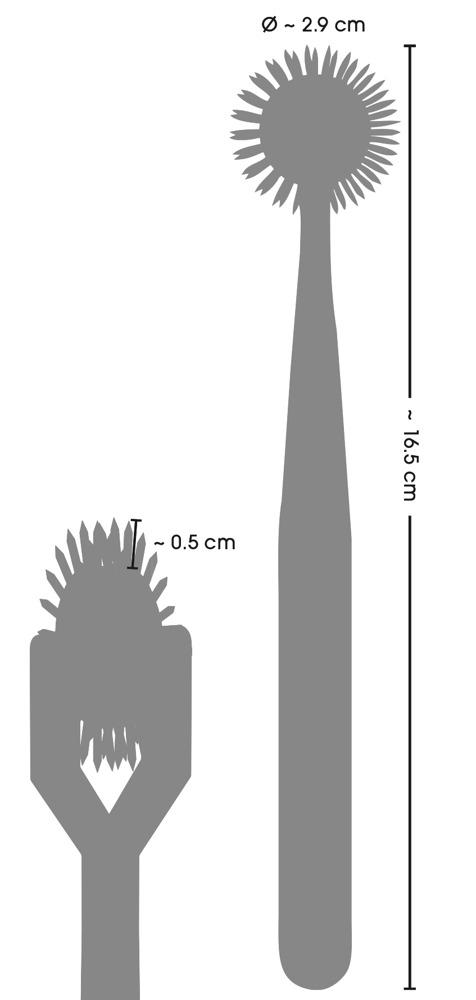 Gesamtlänge 16,5 cm, Rädchen-Ø 2,9 cm, Nadelspitzen 5 mm lang.