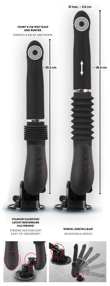 Stoßvibrator RC Fucking Machine 2.0 von You2Toys mit abnehmbarem, im Winkel verstellbarem Saugfuß, der auf jeder glatten Oberfläche fest und sicher haftet für freihändiges Vergnügen.