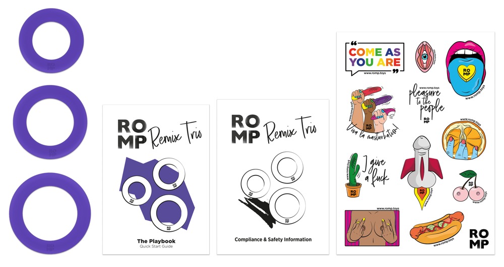 Penis-/Hodenring-Set Remix Trio von ROMP mit 3 Silikonringen in verschiedenen Größen, die einzeln oder zusammen getragen werden können. Umschließen gleichermaßen fest wie dehnbar den Penis und/oder die Hoden. Der stramme Sitz sorgt für aufregenden Druck und kann die Erektion lang anhaltend unterstützen.